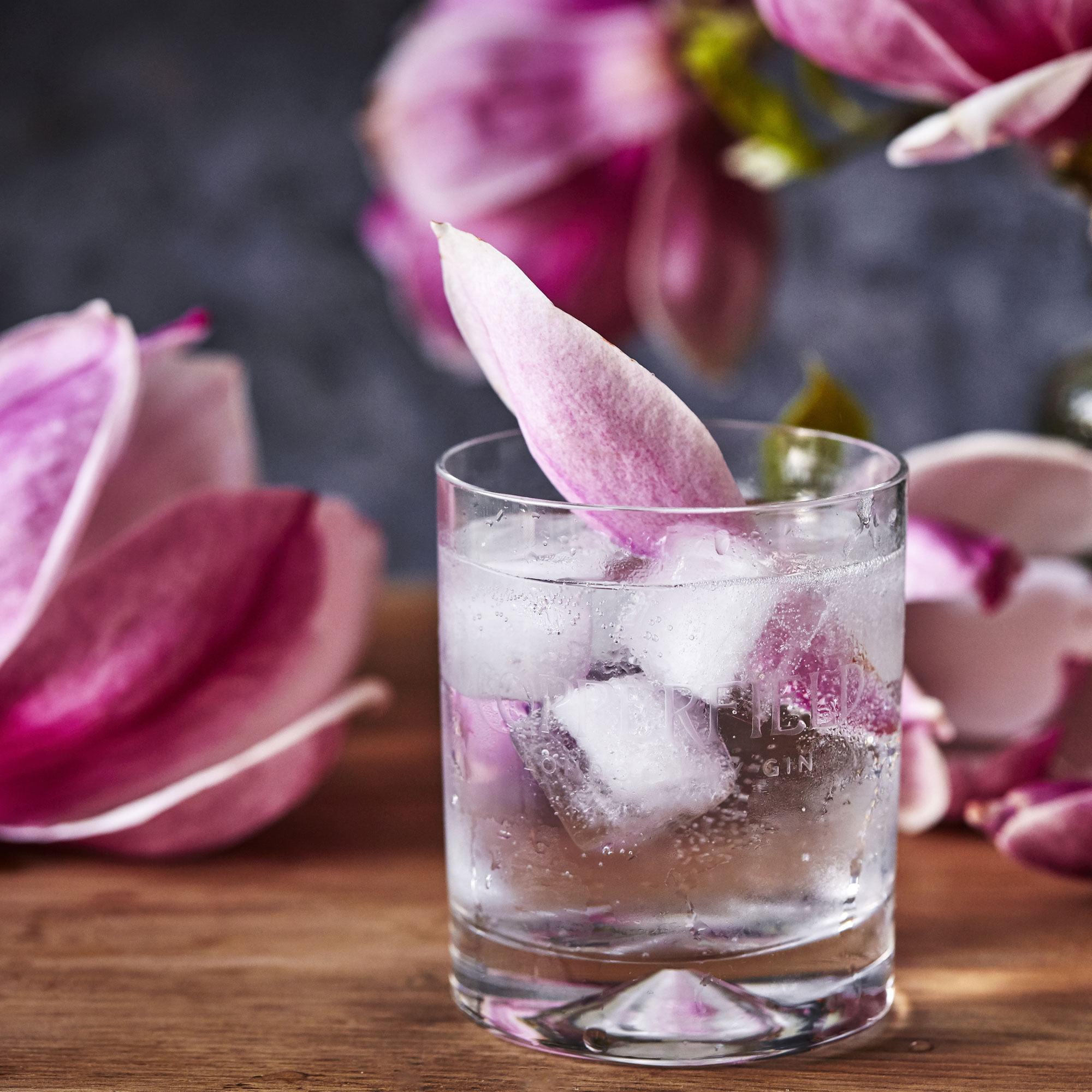 For the perfect serve, pour a measure of Copperfield Magnolia Petal Gin over ice, top with rhubarb and raspberry tonic water, and garnish with fresh raspberries.